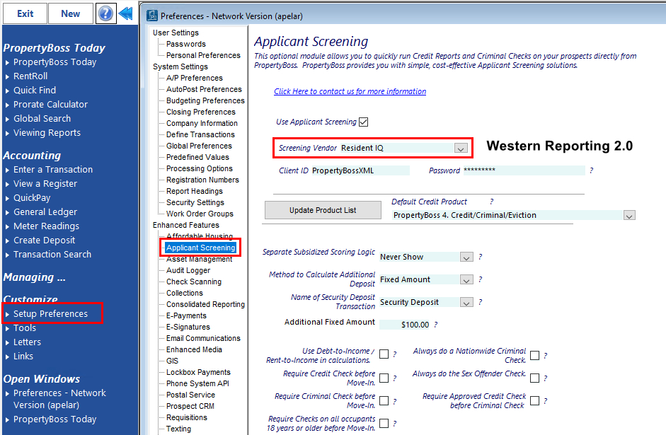 Current clients using screening are being transitioned to Western Reporting 2.0. New clients adding screening to PropertyBoss will be placed on Western Reporting 2.0.