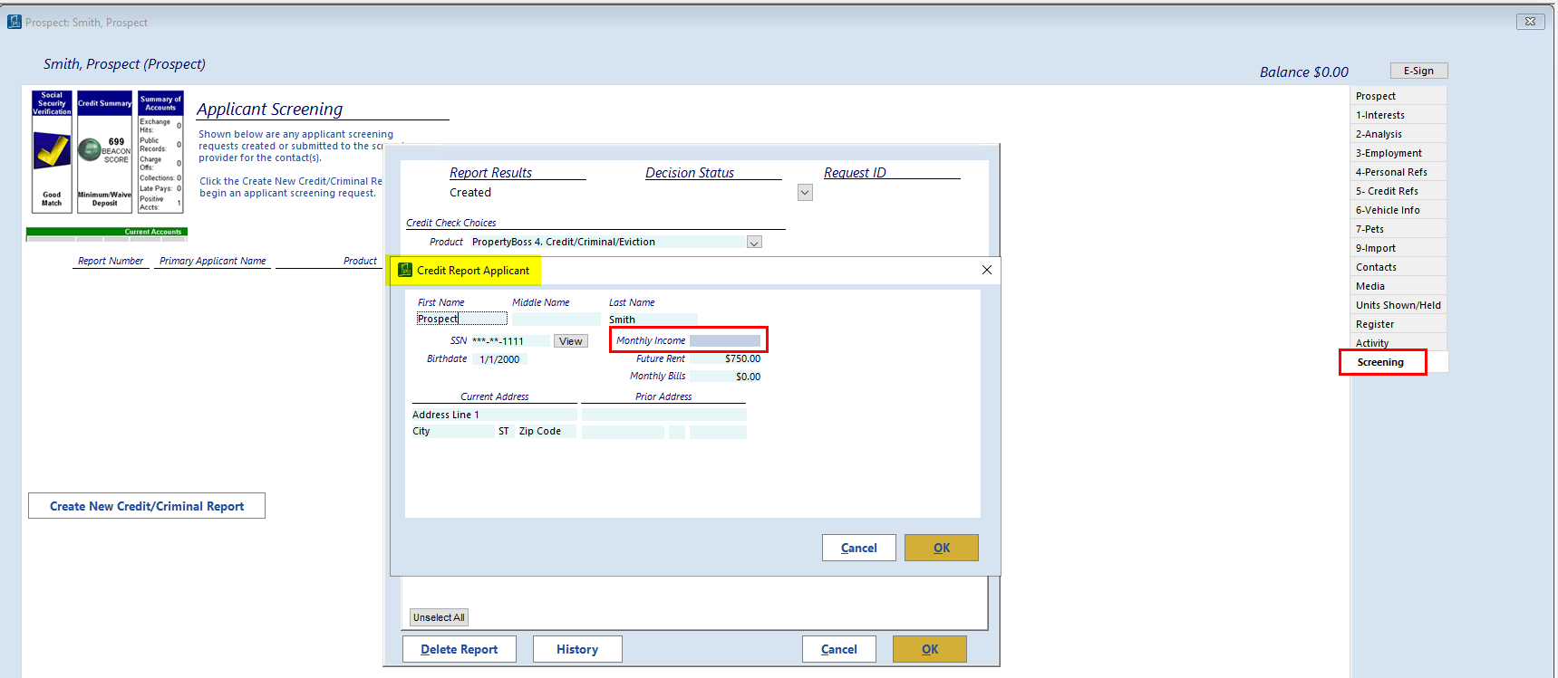 Monthly Income can be entered on the Prospect Notebook or on the Credit Report Applicant window.