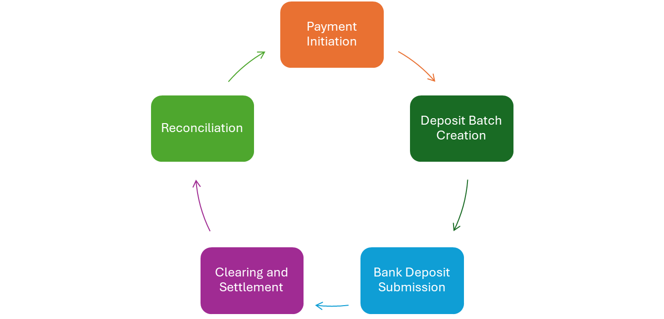 The deposit batch is sent to the bank electronically. The bank processes the deposit, and funds are transferred to a clearing account.